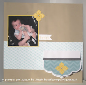 Finally I made a 12"x12" scrap page. Again I've added Crumb Cake, Daffodil Delight and Comfort Cafe papers to the mix. I love this photo of Blake as a baby and is one of many I have printed off ready in the room of craft to scrap with. We used to call him monkey feet as he always held his bottles with his feet not his hands! I've popped one of the flower embellishments on and made a banner from one of the cards - again no stamping involved.
